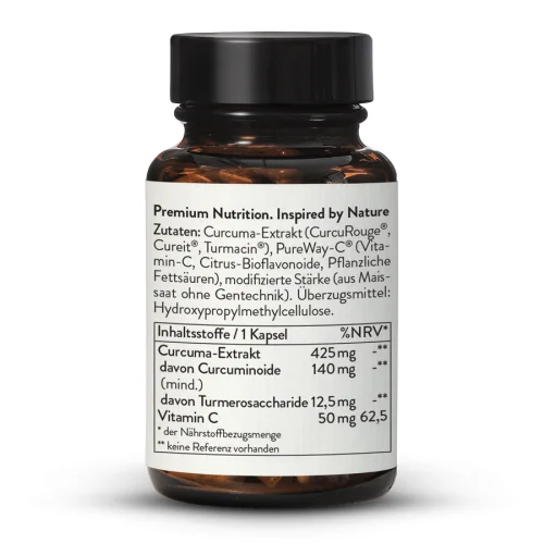 Weltweit einzigartige Kombination der Spitzen-Curcuma-Extrakte Cureit® (Vollspektrum Kurkuma-Matrix inkl. ätherischen Ölen) + Turmacin® (Turmerosaccharide) + CurcuRouge® (Curcuminoide) plus Premium Vitamin C, ummantelt mit pflanzlichen Fettsäuren plus Citrus-Bioflavonoid-Komplex für verbesserte Resorption. Einzigartige Synergie der wichtigsten aktiven Inhaltsstoffe der Curcuma-Wurzel. 93x höhere Bioverfügbarkeit als gewöhnliche Extrakte. Frei von synthetischem Curcuma, Piperin und Nanoverkapselung. Mit ballaststoffreicher Stärke aus Maissat.